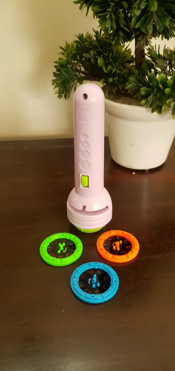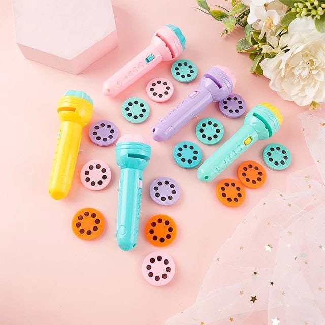 A fun and educational toy for kids that works as both a handy torch and a mini projector. Comes with 3 interchangeable slides featuring colorful images that can be projected onto any flat surface like walls or ceilings.